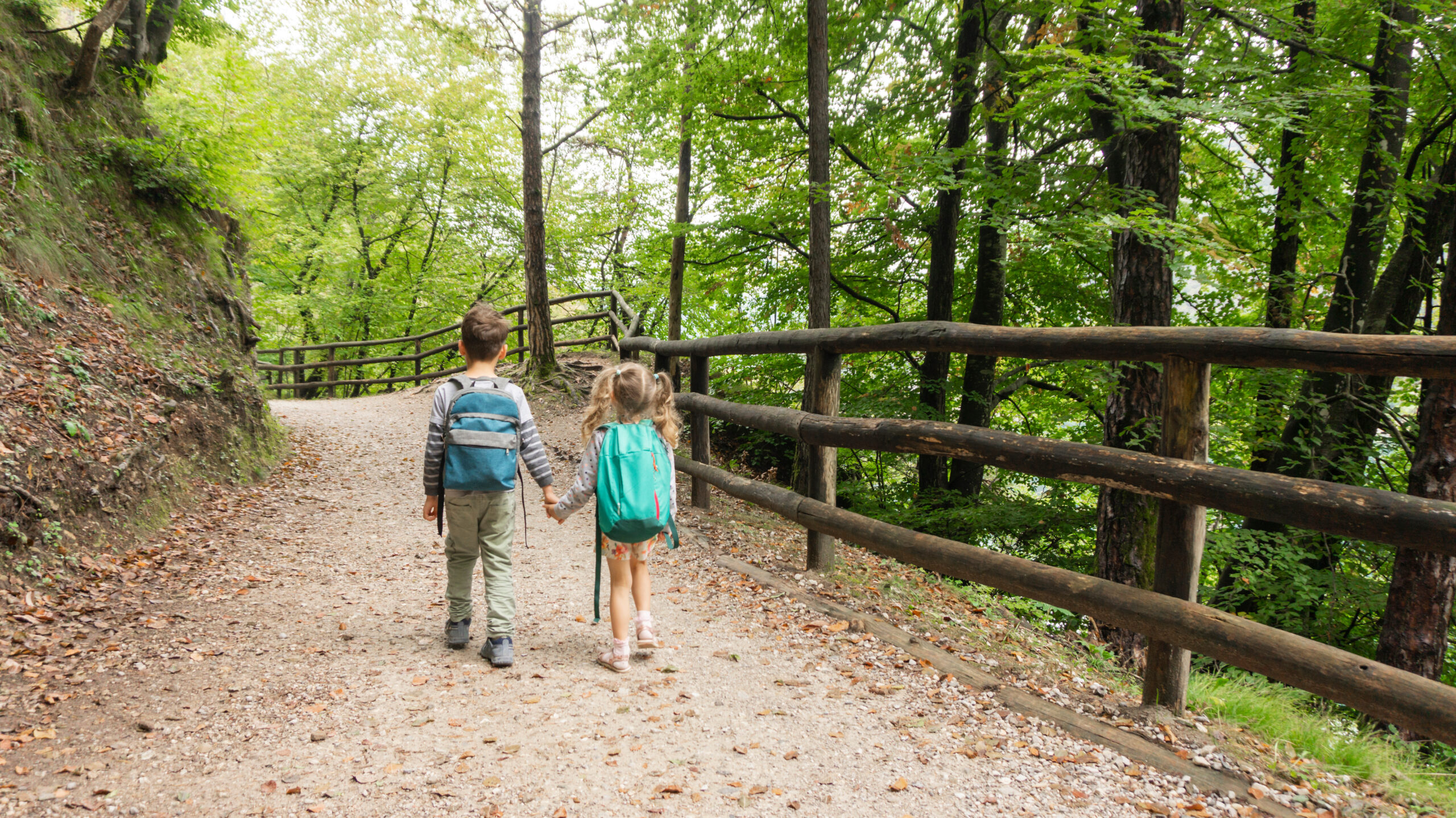 Little tourists boy and girl holding hands go to family camping